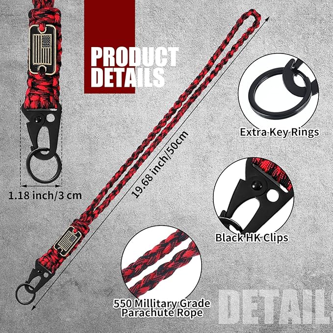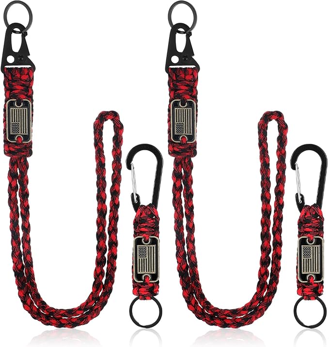 - Package includes: you will get 2 pieces of heavy duty paracord lanyards and 2 pieces of key chain in red and black color; Sufficient quantity can meet your different use and replacement, suitable for a variety of outdoor activities