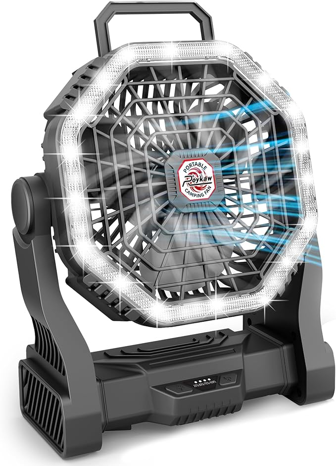 Roykaw Portable Camping Fan with 10400 mAh Rechargeable Battery, 36 Hrs Work, Ultra-bright LED Light & Cordless, Fit for Tent, Fishing, Bedroom, Office, Hurricane