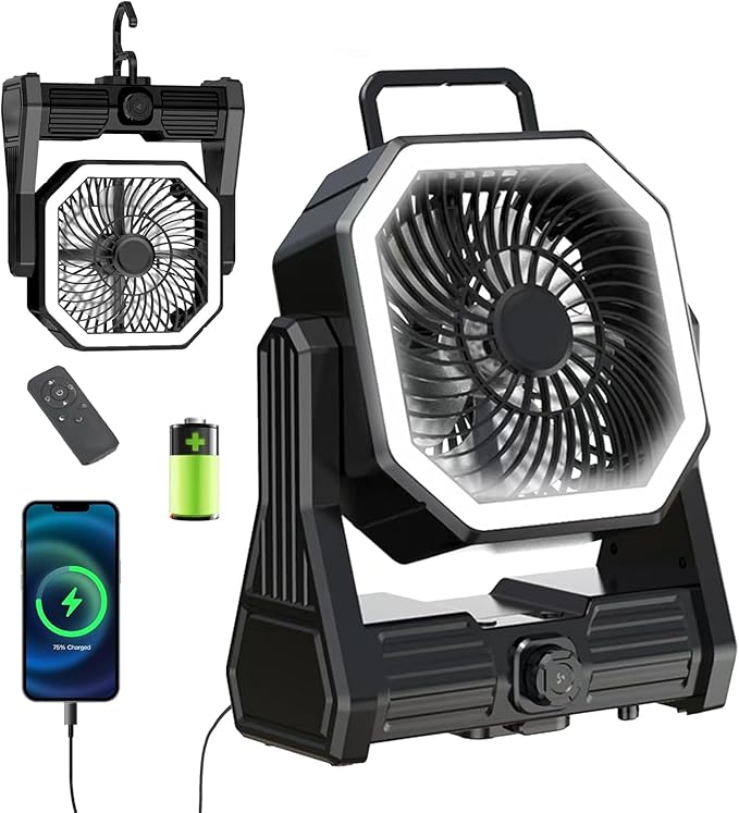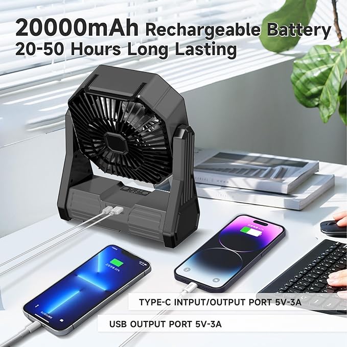 - 20,000mAh Battery & Power Bank Combo: This battery operated fan keeps you cool longer while charging your devices via USB-C and USB-A ports. Perfect for outdoor adventures and travel emergencies