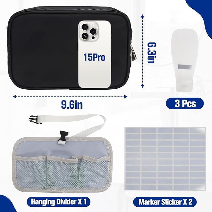 - [ Hanging Toiletry Bag ] The unique hanging divider design and three travel-size bottles allow you to easily hang the toiletry bag on a hook or shower head in the bathroom, saving space and keeping your toiletries neat and organized. Note: Empty dispensing containers must be labeled with a marker pens.