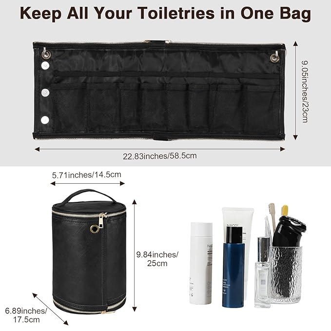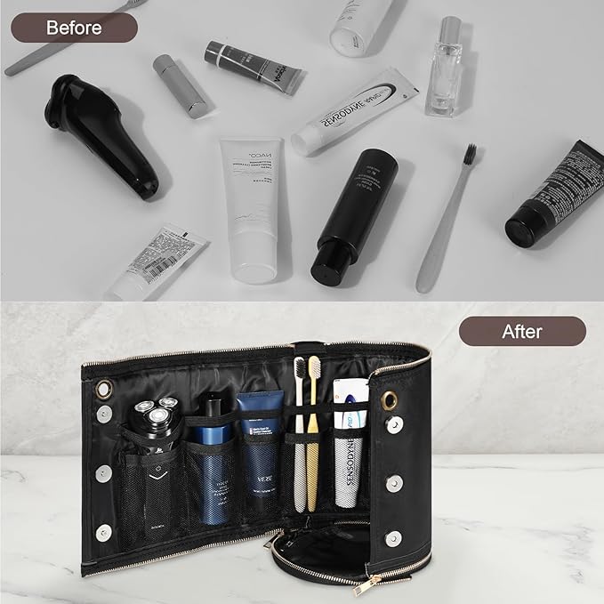 - Compact & Space-saving: Our mens toiletry bag measures 5.71 x 6.89 x 9.84 inches / 14.5 x 17.5 x 25 cm, small and not taking up much space. It can be used flat on the bathroom countertop or hung on the wall to maximize vertical space. It can also be rolled up and put into a backpack or suitcase for easy carrying on the go. Whether you're traveling, on business, on vacation or camping, it is your ideal partner.