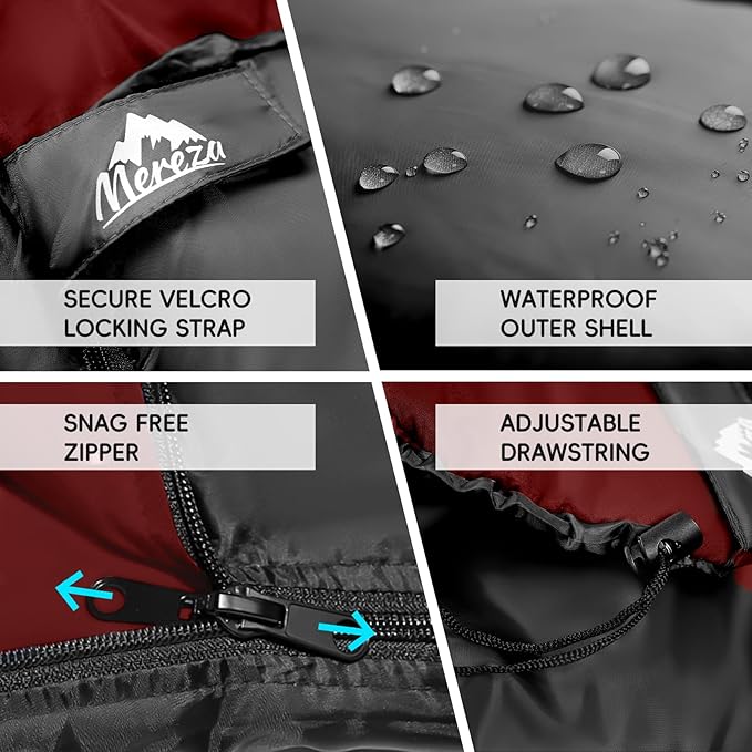 - KEEP WARM DESIGN & WATERPROOF FABRIC : 210T ripstop waterproof polyester shell protects against windy, keep you warm even in cold weather conditions. New synthetic insulation filling offers solid performance. It continues to insulate when wet, prevent you from getting damp. The camping sleeping bag is designed for machine washing as well, ensuring easy maintenance and longevity.