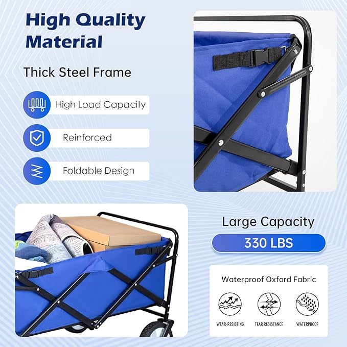 FDW 39''L Collapsible Wagon Cart, Heavy Duty Utility Folding Wagon for Outdoor Sports, 330 LBS Weight Capacity, Camping, Garden, and Shopping, Blue