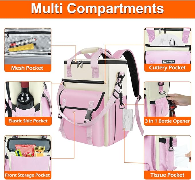- Multi - pocket Design: In addition to the large insulated area, the two front pockets are perfectly sized for stashing away snacks or cutlery, while the side pockets can hold wine bottles and tissues, and the anti - theft zipper pocket on the back is for valuable items. Moreover, we also include a multi - function bottle opener on the cooler for your convenience.
