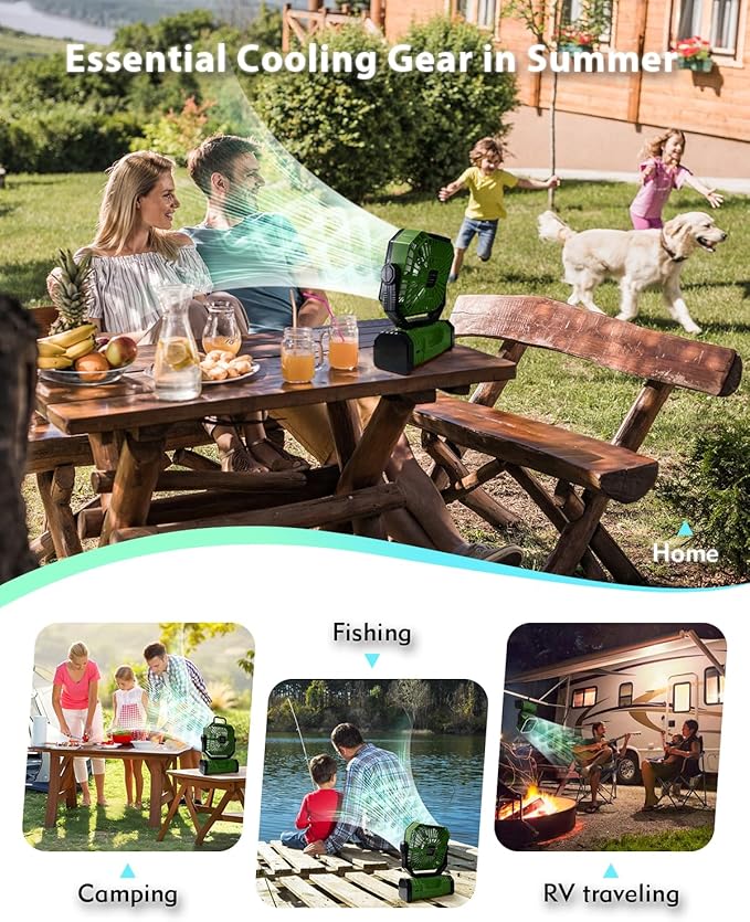 Portable Camping Fan, 20000mAh Rechargeable Battery Operated Oscillating Fan for Tents, 4 Speeds, 360° Rotation Hook, LED Light for Outdoor RV Travel Essentials- Green(No Bluetooth Speaker)