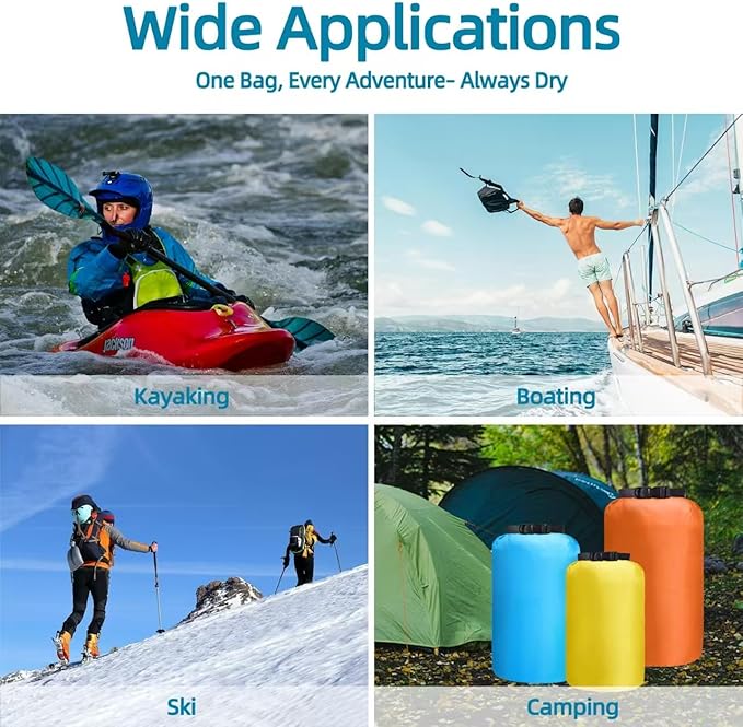 - Built for Adventure – Designed with durable seams and tough construction, these dry bags resist punctures and tears. Ideal for kayaking, hiking, beach days, or boating trips—your gear stays safe no matter where you roam
