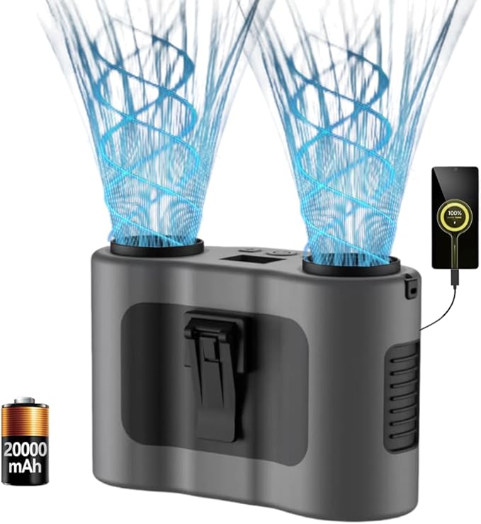 - ● 20000 RPM, 5-speed ultra-strong wind speed, dual air duct rapidly converts hot air into cool air, adjustable wind speed in 5 levels, 130° wide-angle air delivery ensures that every inch of your body can enjoy the coolness, allowing you to experience the comfort of indoor air conditioning even outdoors, 20000mAh battery lasts for 40 hours, giving you peace of mind while working outdoors.