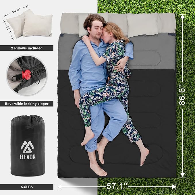 - Convertible Sleeping Bag: Queen size double sleeping bag is effortlessly transforms with zipper—use it as a spacious double bag with 2 pillows for cozy nights or detach into two individual sleeping bags. Perfect for camping, it also unzips completely into two large blankets or mats for picnics, outdoor events, for home lounging, offering unmatched flexibility for any adventure or relaxation need